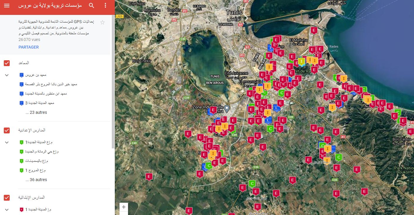 إحداثيات GPS للمؤسسات التابعة للمندوبية الجهوية للتربية ببن عروس