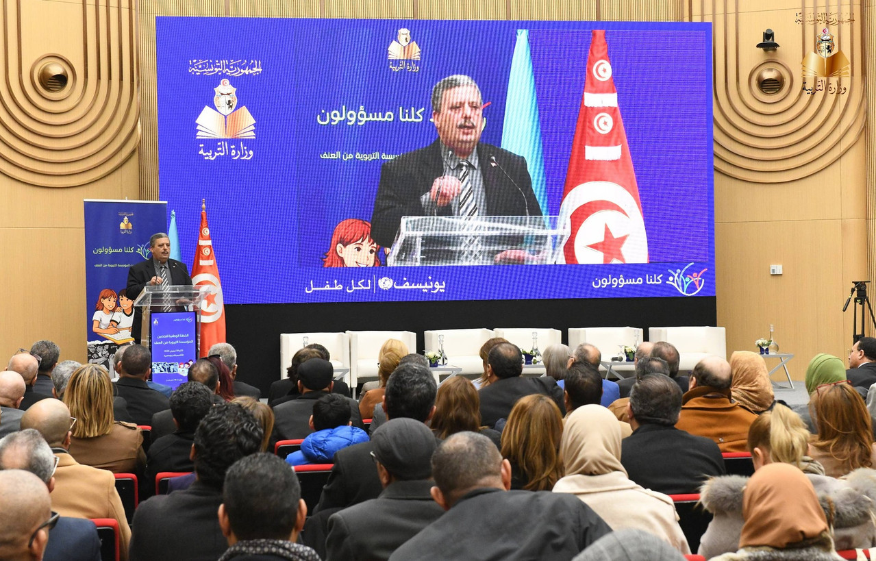 تحت اشراف وزير التربية السيد نور الدين النوري اختتمت صباح اليوم الأربعاء 04 فيفري 2026 بالأكاديمية الدبلوماسية بتونس، أشغال الندوة الوطنية العلمية لإرساء الخطة الوطنية لتحصين المؤسسة التربوية من العنف، وذلك بحضور عدد من إطارات الوزارة مركزيا وجهويا ، وممثلي عدد من الوزارات المتدخلة، إلى جانب ممثلين عن منظمة الأمم المتحدة للطفولة "اليونيسيف"، وثلة من المربين والخبراء وممثلي المجتمع المدني