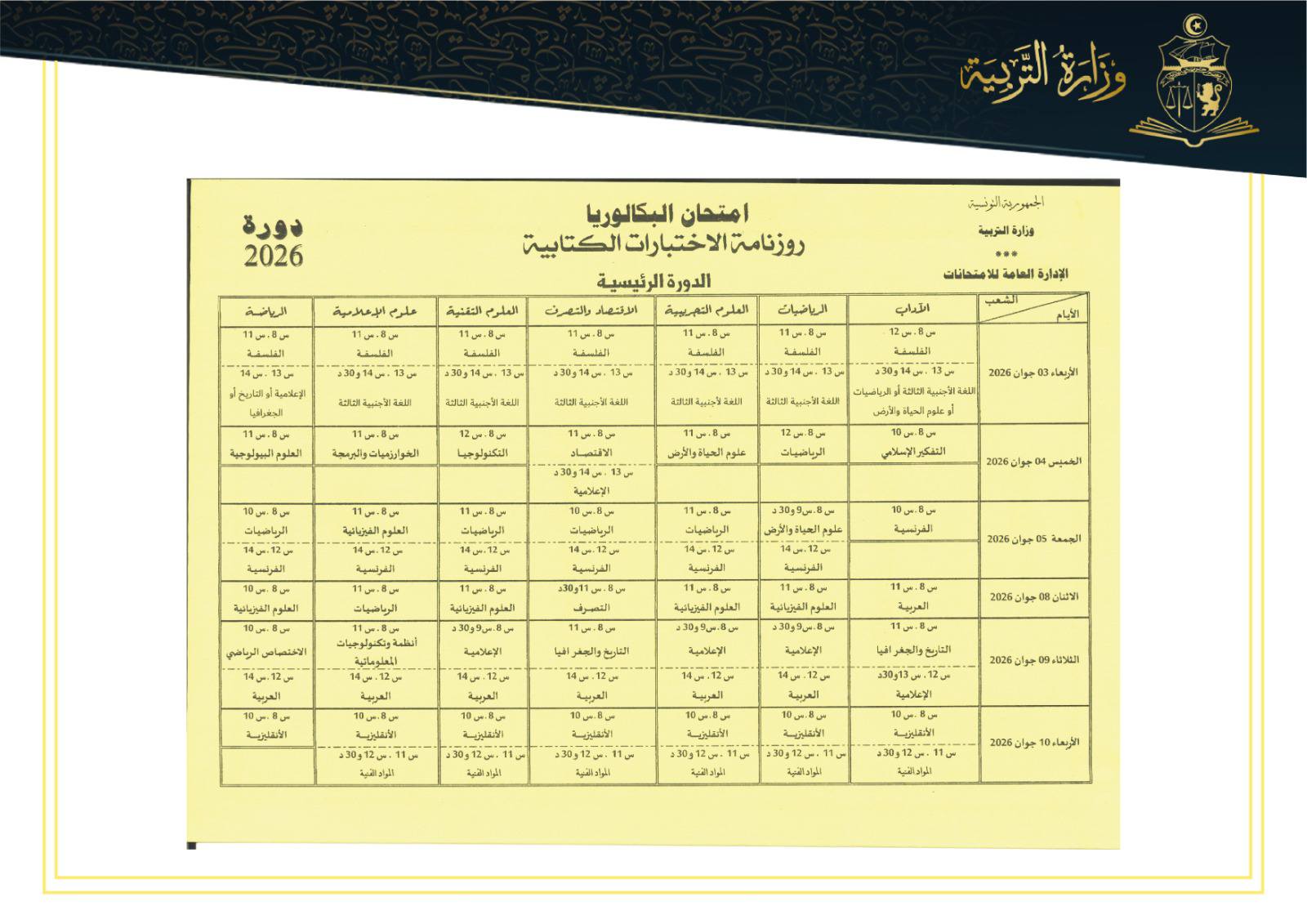 الامتحانات الوطنية لباكالوريا 2026 ستُجرى في دورتها الرئيسية أيام 3 و4 و5 و8 و9 و10 جوان 2026، على أن يتم الإعلان عن النتائج يوم الثلاثاء 23 جوان 2026، أما دورة المراقبة، فستنطلق أيام 29 و30 جوان و1 و2 جويلية 2026، وسيتم الإعلان عن نتائجها يوم الأحد 12 جويلية 2026.