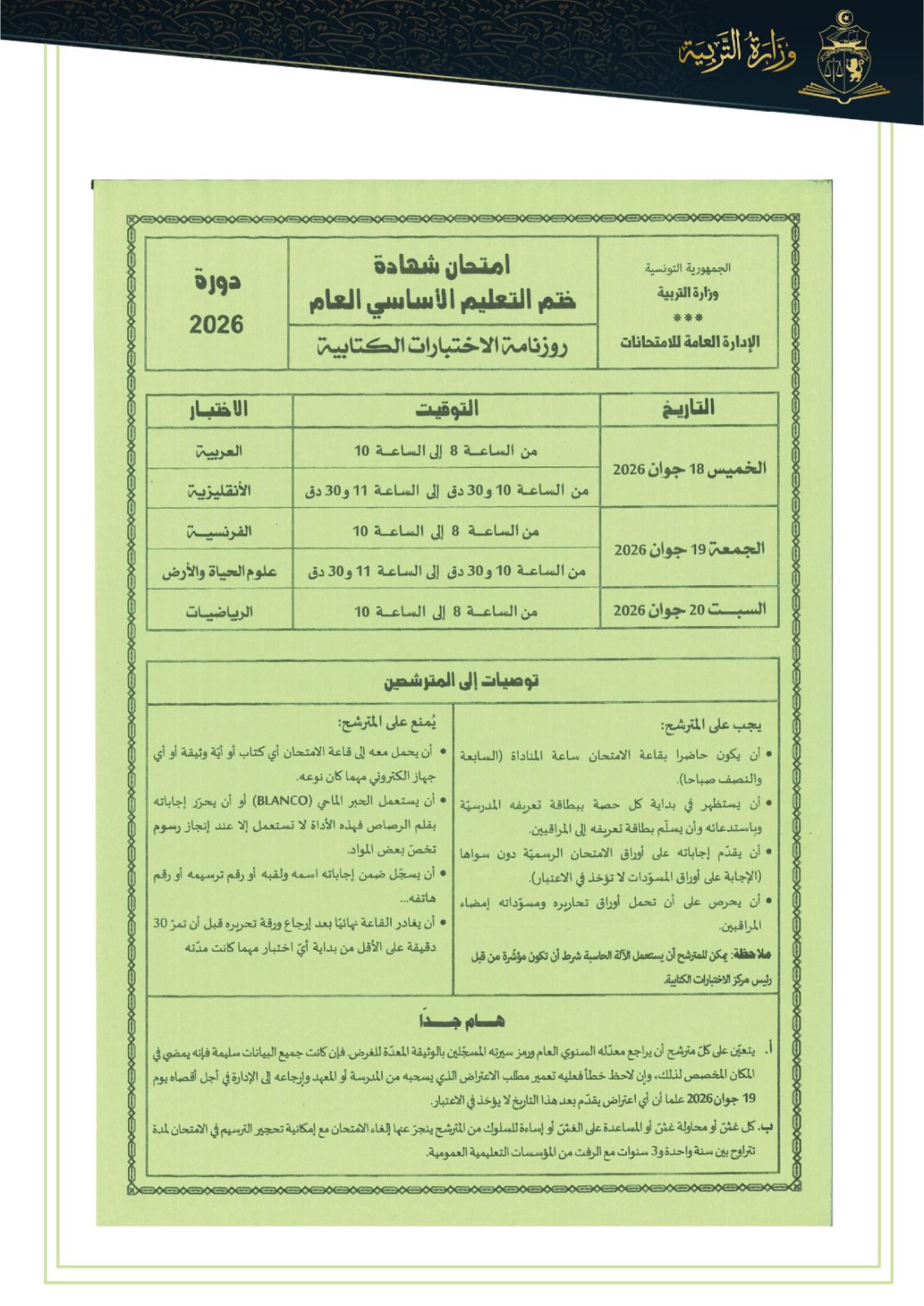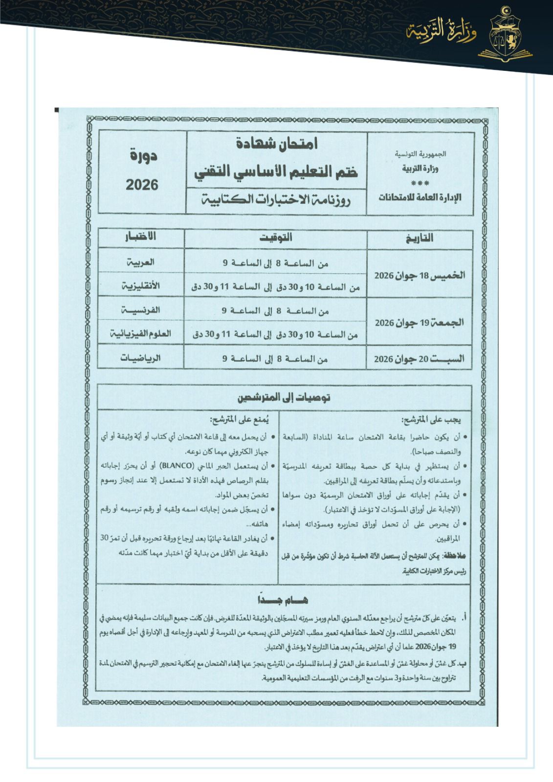 امتحان شهادة ختم التعليم الأساسي العام والتقني ستُجرى أيام 18 و19 و20 جوان وسيتم الإعلان عن النتائج يوم 6 جويلية 2026.