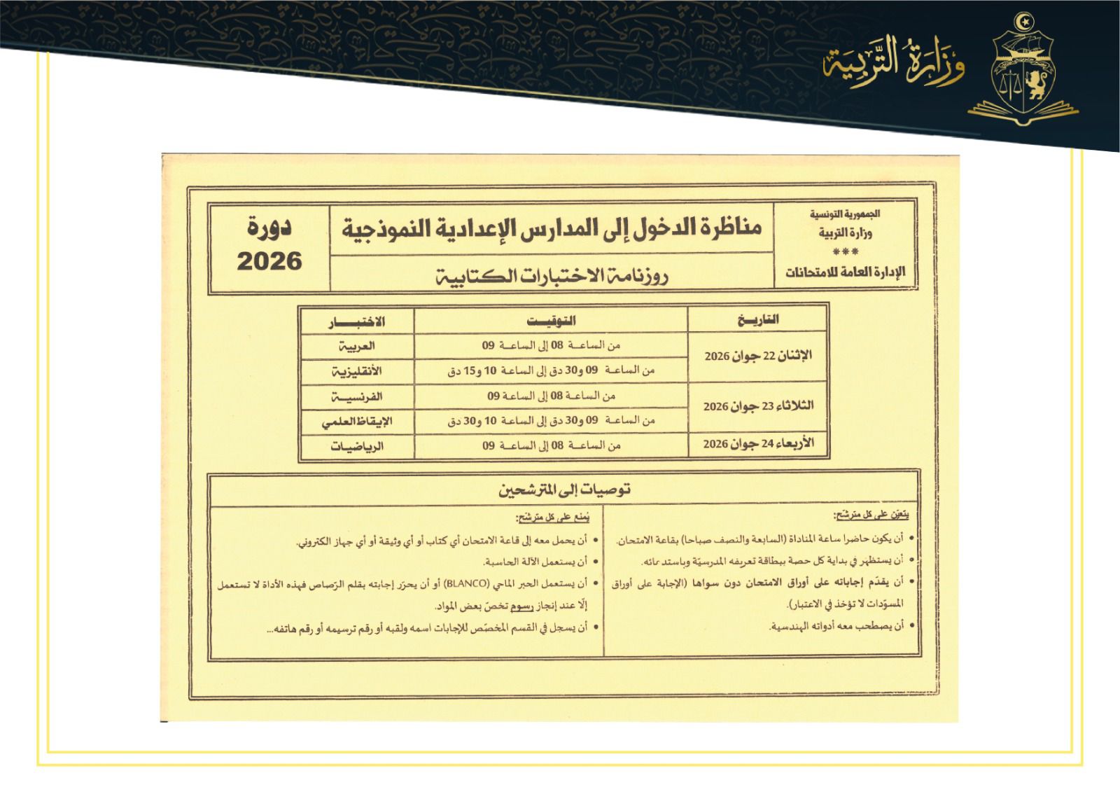 مناظرة الدخول إلى المدارس الإعدادية النموذجية، فسيكون أيام 22 و23 و24 جوان على أن يتم الإعلان عن نتائجها يوم الجمعة 10 جويلية 2026.