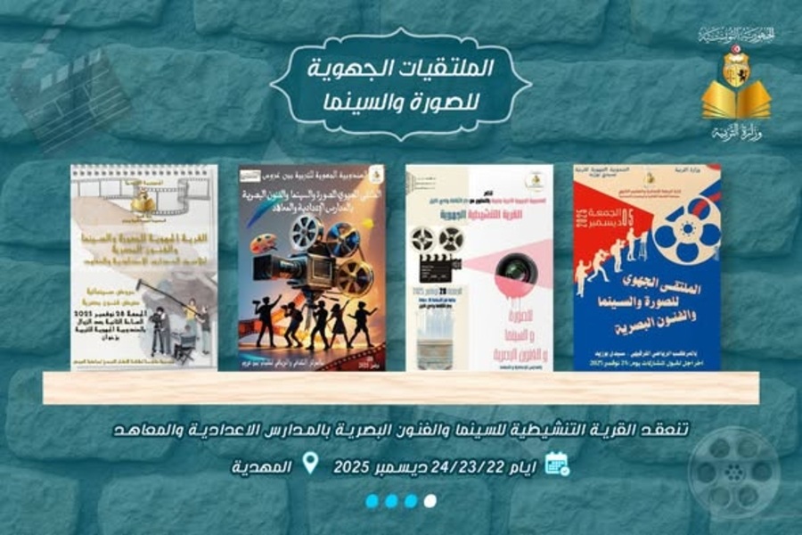 انطلاق الملتقيات الجهوية للسينما والصورة والفنون البصرية وذلك استعدادا للمشاركة في مسابقة القرية التنشيطية الوطنية الاولى للسينما والصورة بالمدارس الاعدادية والمعاهد الثانوية التي من المبرمج ان تحتضنها ولاية المهدية من 22 الى 24 ديسمبر القادم